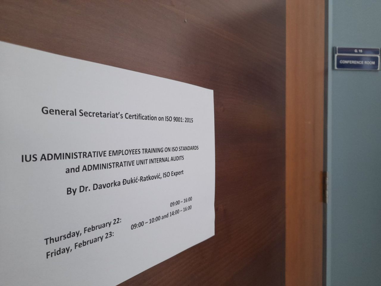 Dr. Davorka Đurić-Ratković, istaknuti stručnjak za ISO standarde, angažovana je za obuku internih revizora, odnosno osam zaposlenika IUS-a. Obuka koja je održana 22. i 23. februara 2024. godine na IUS-u je uključivala i teorijske i praktične dijelove. Praktični segment obuhvatio je analizu potrebne dokumentacije Sistema upravljanja kvalitetom (QMS) kroz interne revizije, pružajući uvide u status i operacije administrativnih jedinica IUS-a.